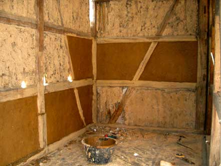 Der Lehmstaken- und Flechtwerkbau ist eine traditionelle Lehmbauweise und findet besonders in der Denkmalpflege seine Anwendung. In dieser Lehmbautechnik werden die einzelnen Gefache eines Fachwerks mit hölzernen Staken ausgesetzt. Dabei werden je nach Technik zusätzliche Weiden- oder Haselnußruten eingeflochten. Das so enstandene Tragwerk wird mit Strohlehm beworfen bzw. umflochten und bildet so einen stabilen Wandaufbau. |